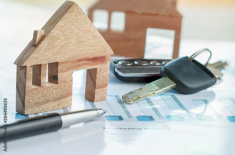 Chart Report Documents Contact To Customer With Car Key Miniature Wood House Models Concept Of Real Estate Mortgage Investment Being Homeowner Asset Business Goal For Saving To Buy Home Or Vehicle Stock